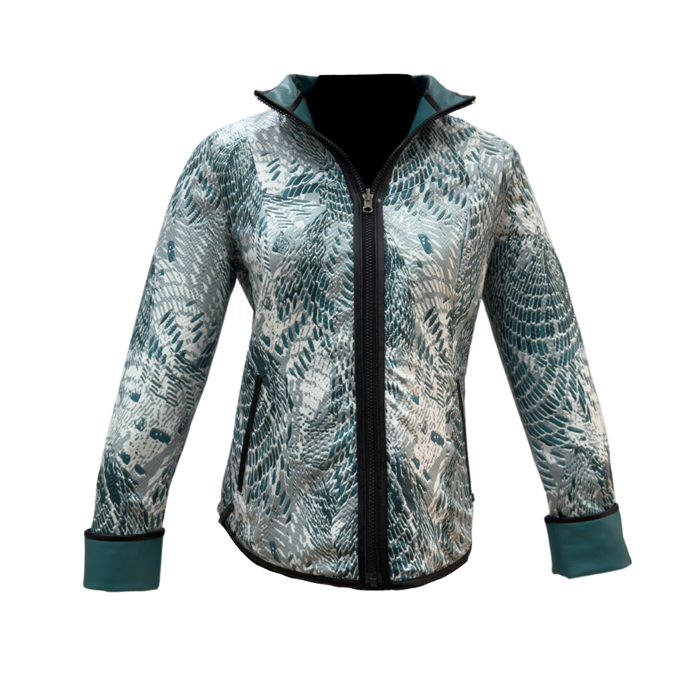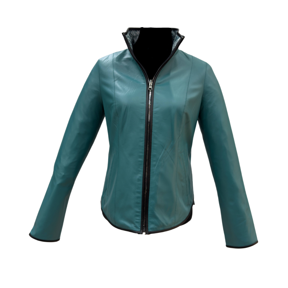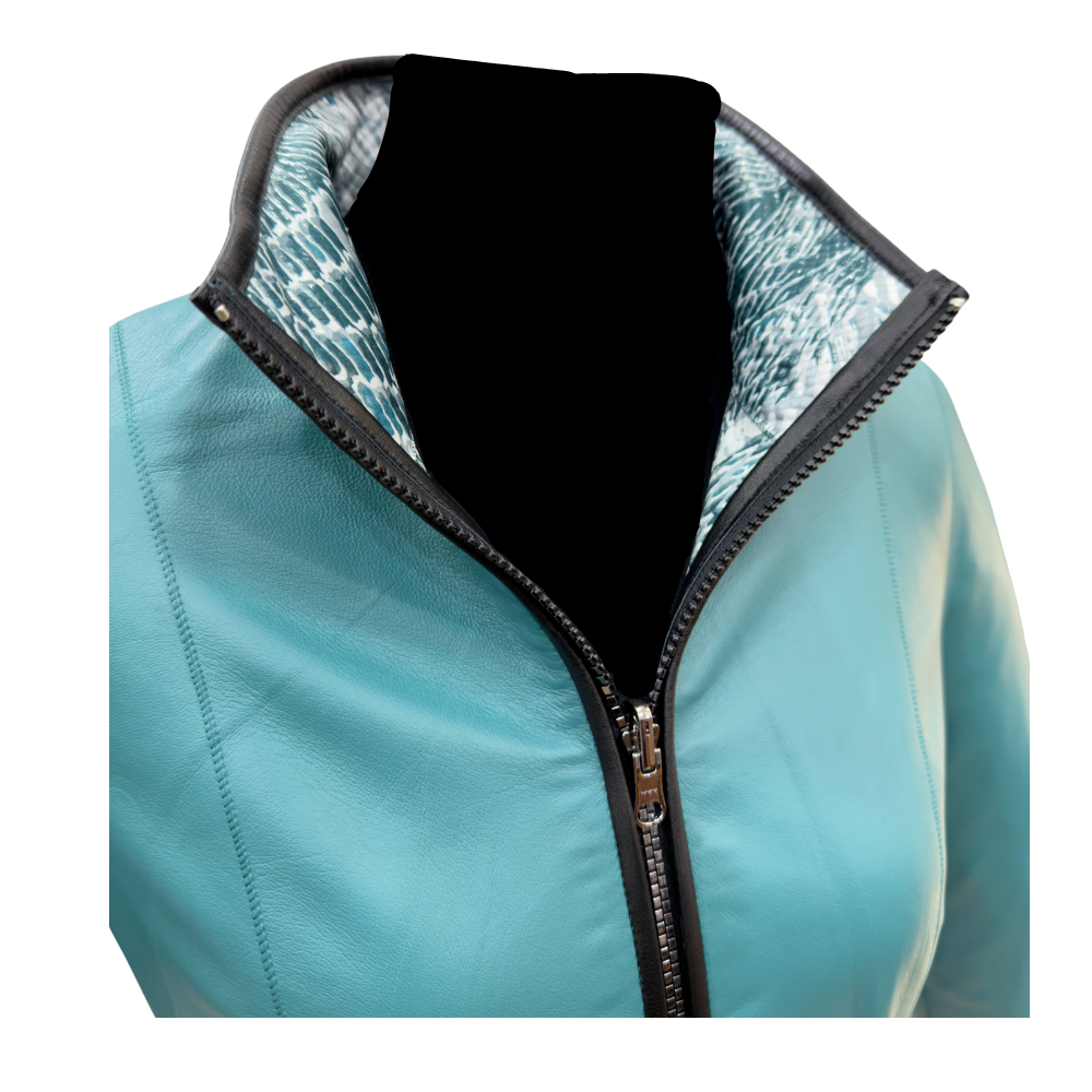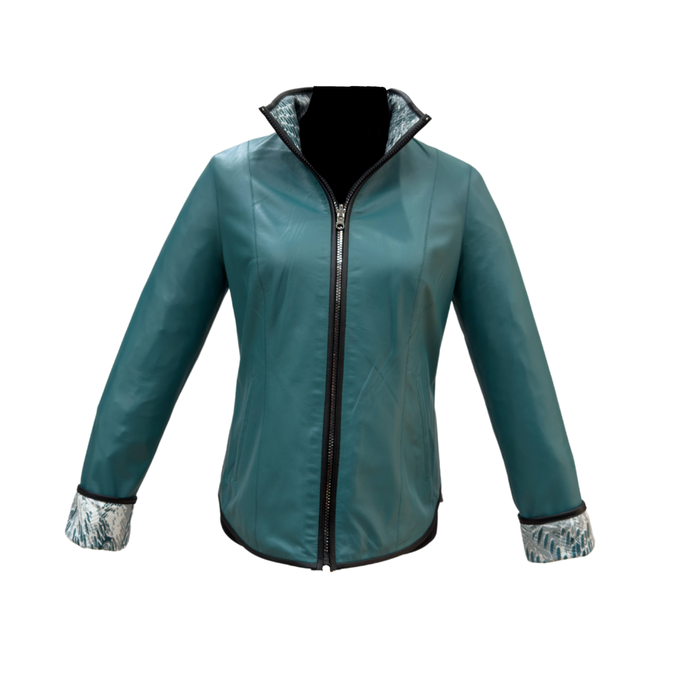 Chaqueta de Cuero Reversible Color Petróleo con Forro Estampado